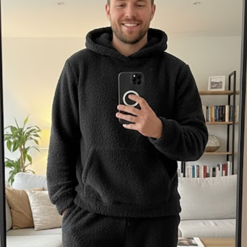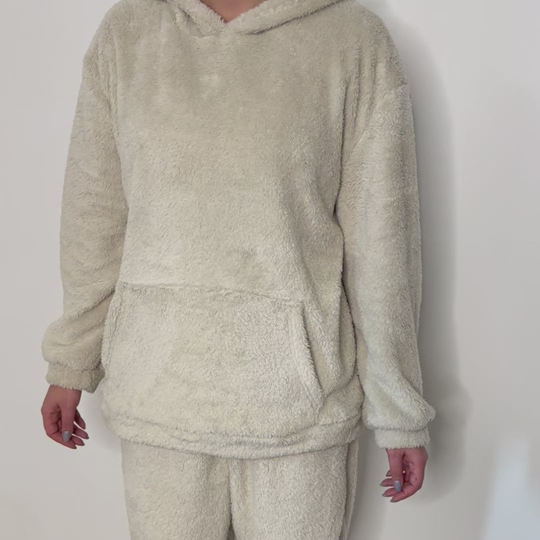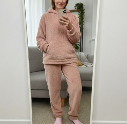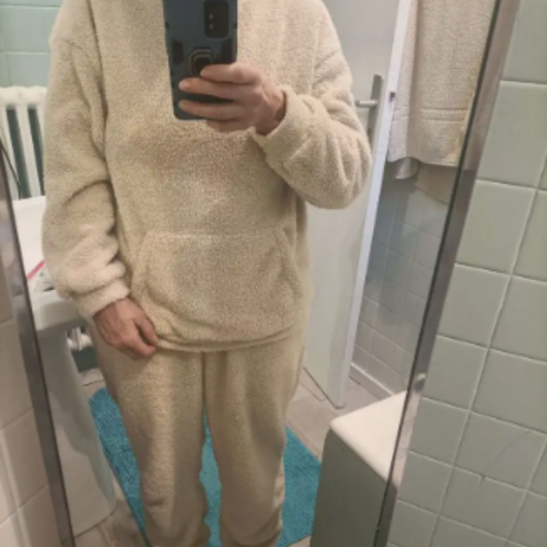 Composé d’un haut à capuche et d’un pantalon assorti, cet ensemble doux a été pensé pour t’envelopper de chaleur et de confort.